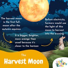The Harvest Moon is the full moon that rises closest to the autumn equinox, usually in September. Unlike typical full moons, it seems larger and brighter, rising earlier for several nights in a row. This effect once gave farmers extra time to gather crops after sunset.